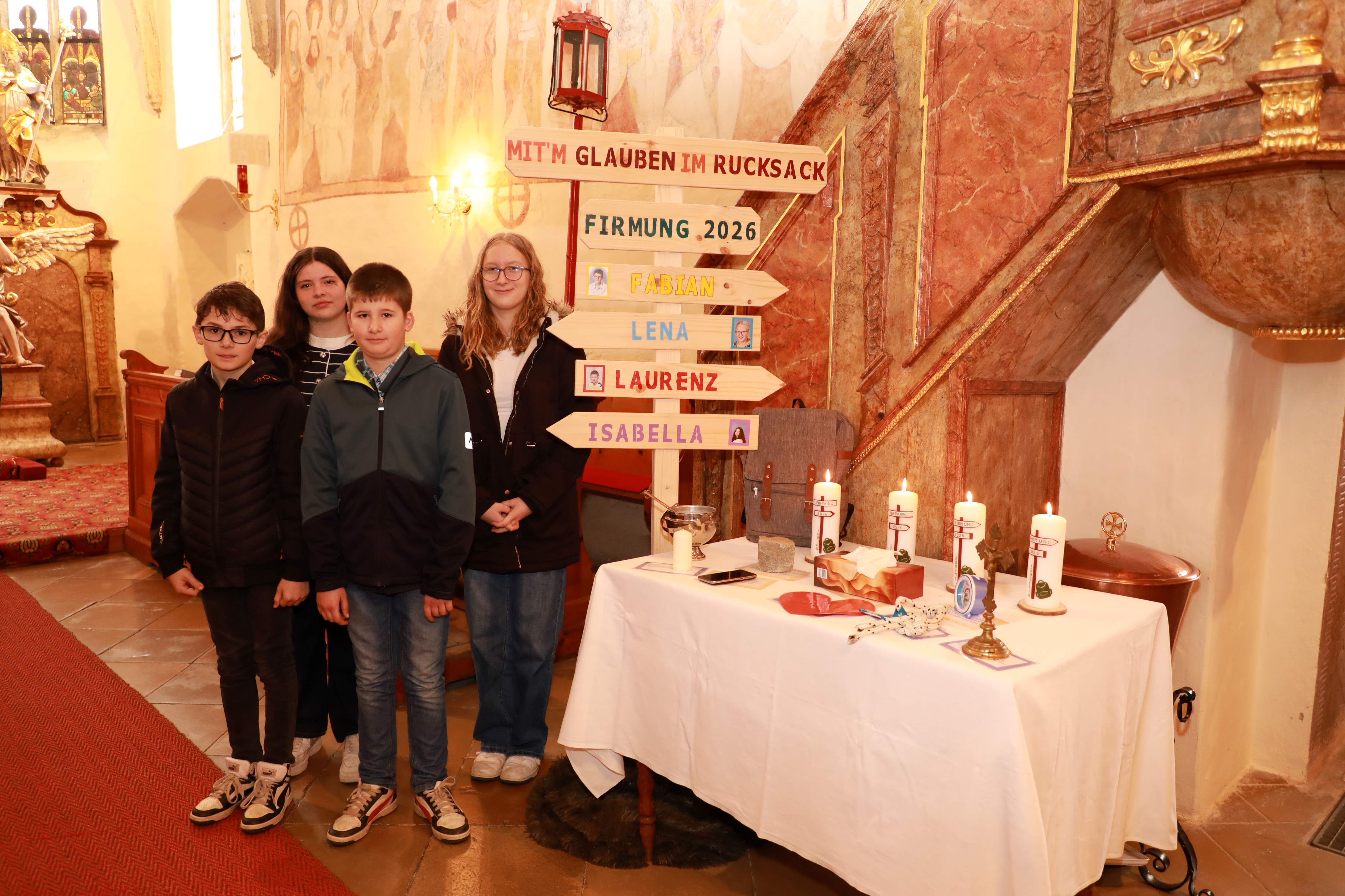 „MIT’M GLAUBEN IM RUCKSACK“ – so lautet das Motto der diesjährigen Firmvorbereitung. Am 15.März 2026 stellte Pfarrmoderator Oliver im Rahmen einer schön gestalteten Messe des Chors „taktvoll“ die diesjährigen Firmkandidaten vor. Unsere Firmlinge Laurenz Kerschbaumer, Isabella Posch, Lena Reichinger und Fabian Zeilinger haben zu Beginn das Thema vorgestellt und anhand verschiedener Dinge gezeigt, was den Lebensrucksack schwer, aber auch leichter machen kann. Seit dem Start der Vorbereitungsstunden im Jänner 2026 haben wir uns bereits mit mehreren Themen wie GLAUBE, SAKRAMENTE und VERSÖHNUNG auseinandergesetzt. In den nächsten Monaten werden noch einige Treffen stattfinden, in denen wir uns weiter auf das Sakrament der Firmung vorbereiten werden. Die Pfarrfirmung findet am 13. Juni 2026 in der Pfarrkirche Weiten statt.