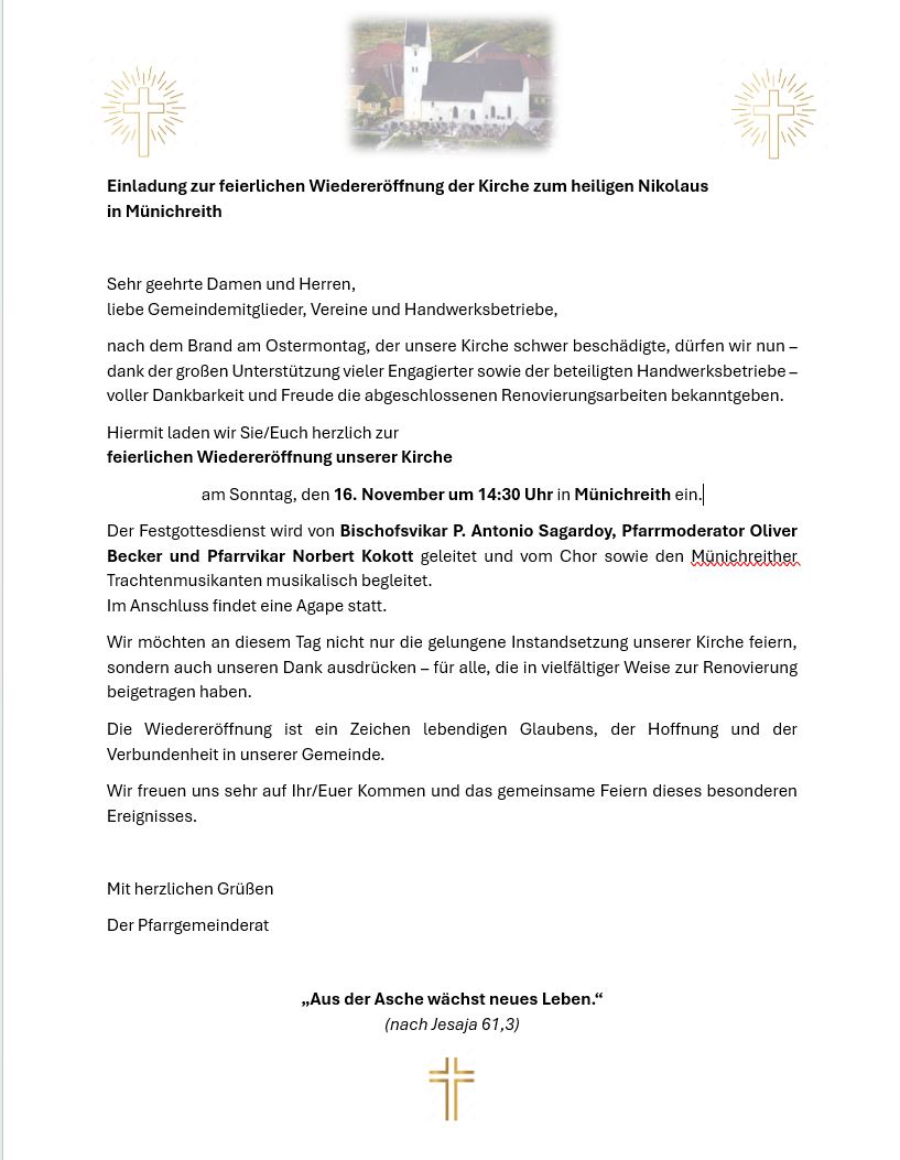 Einladung zur feierlichen Wiedereröffnung der Kirche zum heiligen Nikolaus in Münichreith
